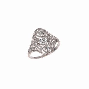 ANELLO A LOSANGA CON DIAMANTI in platino, impreziosito al centro da tre diamanti taglio vecchio per ct 0.70 circa, [..]