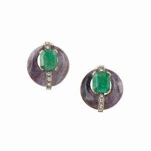 PAIO DI ORECCHINI CON SMERALDI E AMETISTE in oro giallo e bianco 18kt, composti da dischi di ametiste con al centro [..]