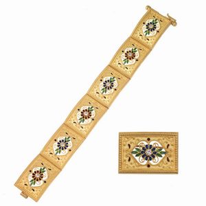 SPILLA E BRACCIALE CON MOTIVI FLOREALI in oro giallo 18kt, bracciale a fascia decorato in samlti policromi, composto [..]