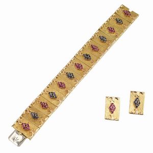 DEMI PARURE CON ZAFFIRI E RUBINI in oro giallo 18kt, composta da bracciale e paio di orecchini, realizzati a forma [..]