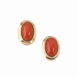 PAIO DI ORECCHINI CON CORALLO in oro giallo 18kt, di forma ovale, impreziositi al centro da coralli taglio cabochon, [..]