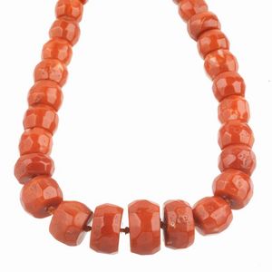 LUNGA COLLANA IN CORALLO composta da un filo di barilotti in corallo digradanti da mm 17x10 a 5x4 circa, fermatura [..]