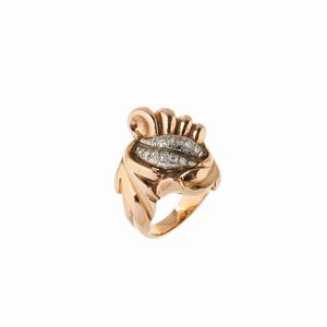 ANELLO A VOLUTE in oro rosa e bianco 18kt, impreziosito da diamanti taglio vecchio per ct 0.10 circa, mis. 49, [..]