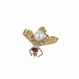 SPILLA A FORMA DI MOSCA CON PERLA RUBINI E DIAMANTI in oro giallo 18kt, impreziosita da una perla di mm 9 circa, [..]