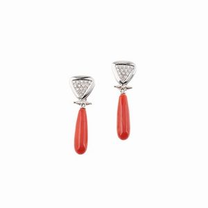 PAIO DI ORECCHINI PENDENTI CON CORALLO E DIAMANTI in oro bianco 18kt, con due elementi pendenti in corallo, impreziositi [..]