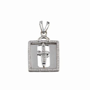 PENDENTE CON DIAMANTI in oro bianco 18kt, di forma quadrata, raffigurante al centro una spada con fodero, impreziosito [..]