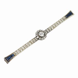 SPILLA A BARRETTA CON DIAMANTI E ZAFFIRI SINTETICI in oro bianco 18kt, impreziosita da diamanti taglio vecchio, [..]