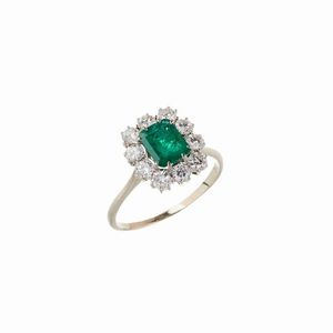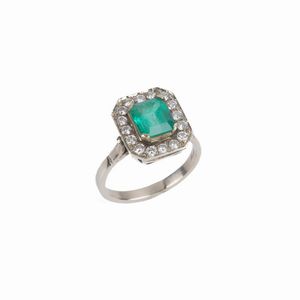 ANELLO A MARGHERITA CON SMERALDO E DIAMANTI in oro bianco 18kt, con al centro uno smeraldo taglio ottagonale di [..]