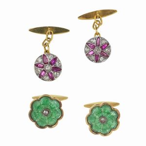 DUE PAIA DI GEMELLI MOTIVO FLOREALE in oro e argento, raffiguranti motivi floreali, di cui uno impreziosito da [..]