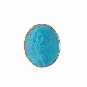 SPILLA IN PASTA DI TURCHESE di forma ovale, montatura in oro giallo 18kt recante al centro un elemento inciso [..]