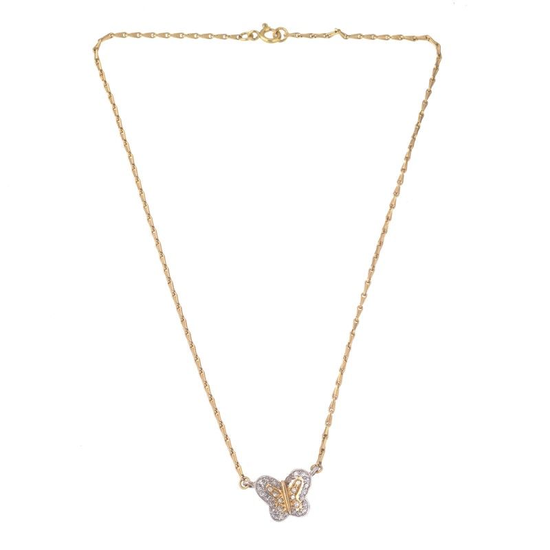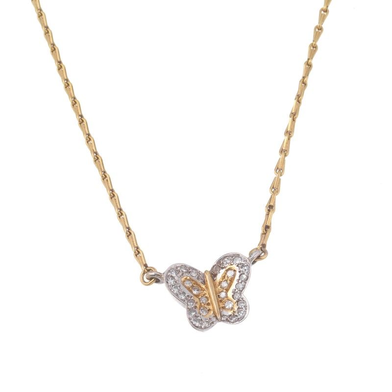 GIROCOLLO CON PENDENTE A FORMA DI FARFALLA catena in oro giallo 18kt, da cui pende un ciondolo a forma di farfalla in oro giallo e bianco 18kt impreziosito da diamanti taglio huit huit per ct 0.20 circa, punzoni 750 e del fabbricante, lungh. cm 36, gr. 7