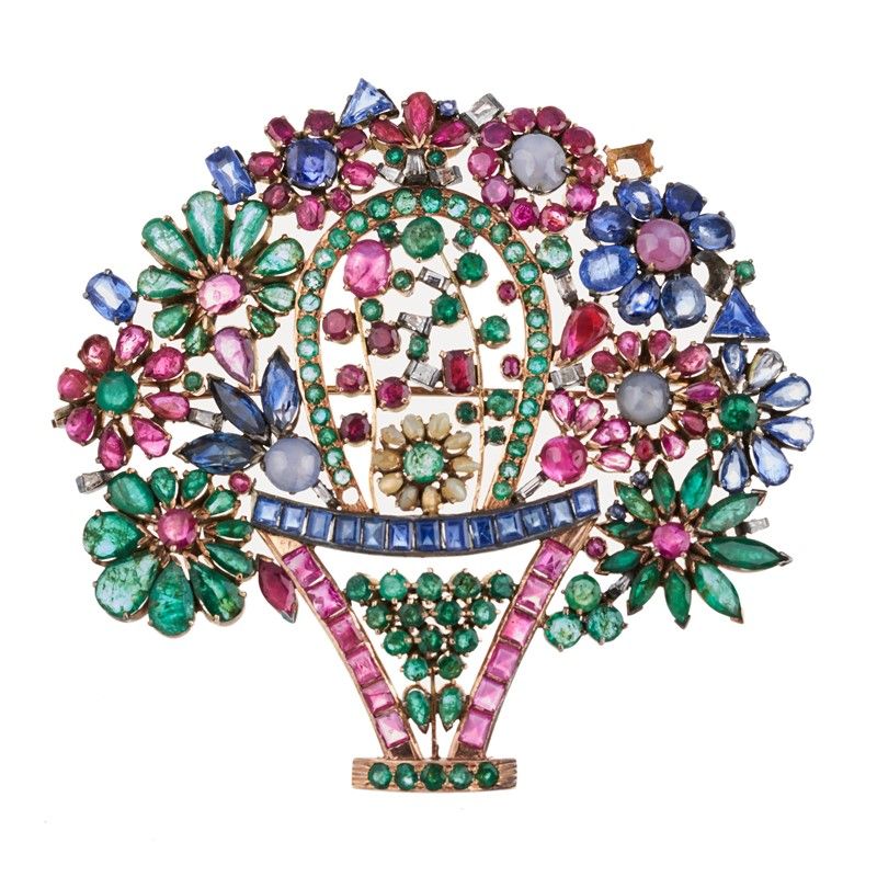 GRANDE SPILLA A FORMA DI CESTO FIORITO CON PIETRE DI COLORE in oro e argento, impreziosito da varie pietre di colore fra cui zaffiri (uno mancante) e rubini taglio fantasia per ct 20 circa, smeraldi taglio rotondo e fantasia (uno mancante) per ct 12 circa e diamanti, dim. cm 8x8 circa, gr. 58