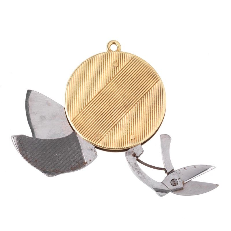 in oro giallo 18kt, corredato di taglierino e forbici in ferro, punzoni 750 e del fabbricante, diam. cm 3,5 circa, gr. 32