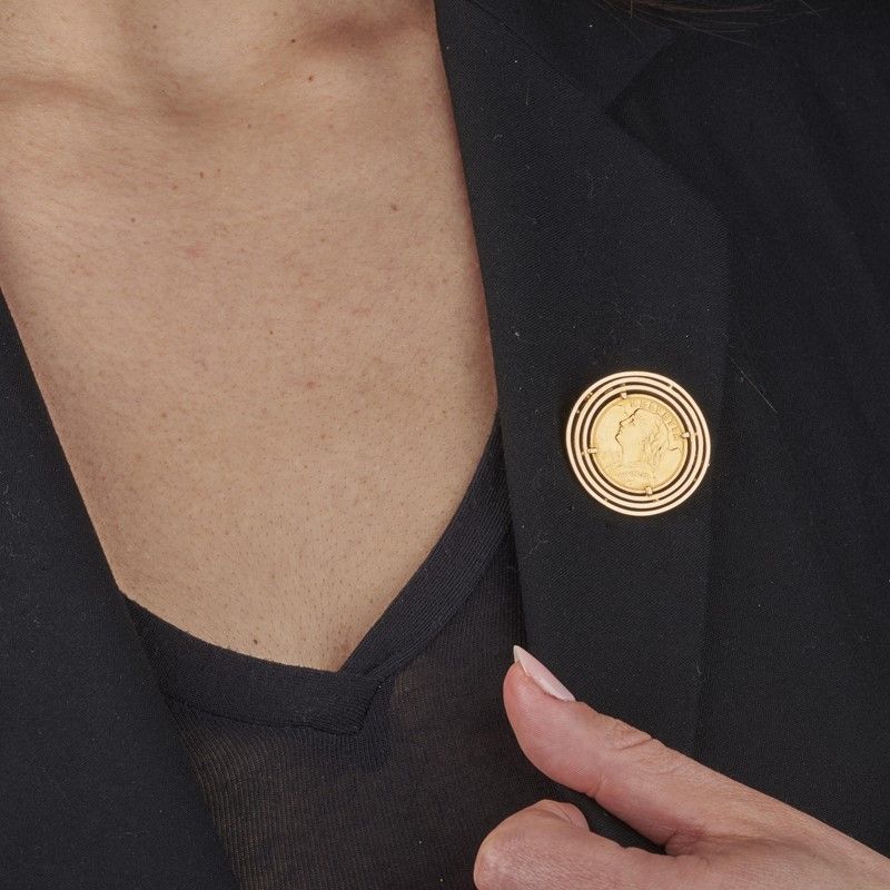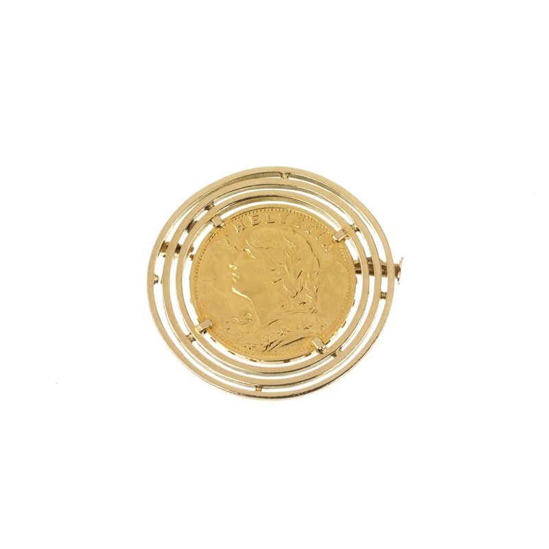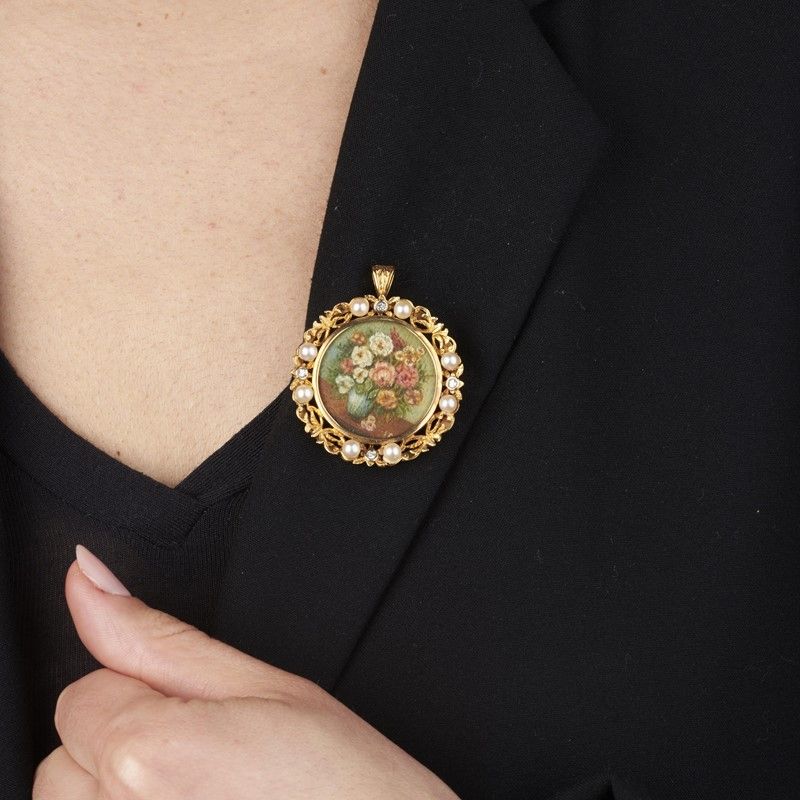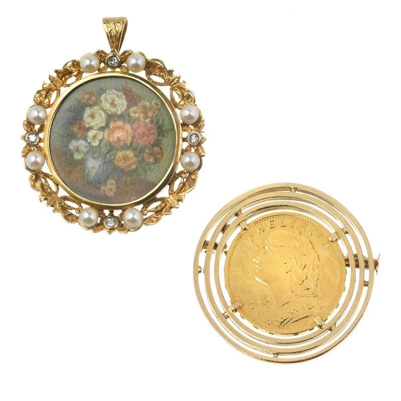LOTTO COMPOSTO DA DUE SPILLE di cui una di forma circolare in oro giallo 18kt, con al centro un dipinto floreale entro cornice a tralci, circondata da perle di mm 3 circa e diamanti taglio huit huit per ct 0.10 circa, indossabile anche come pendente grazie al passante, punzoni 750 e del fabbricante, dim. cm 3,5x4,5; accompagnata da una seconda spilla con moneta, gr. 24 complessivi