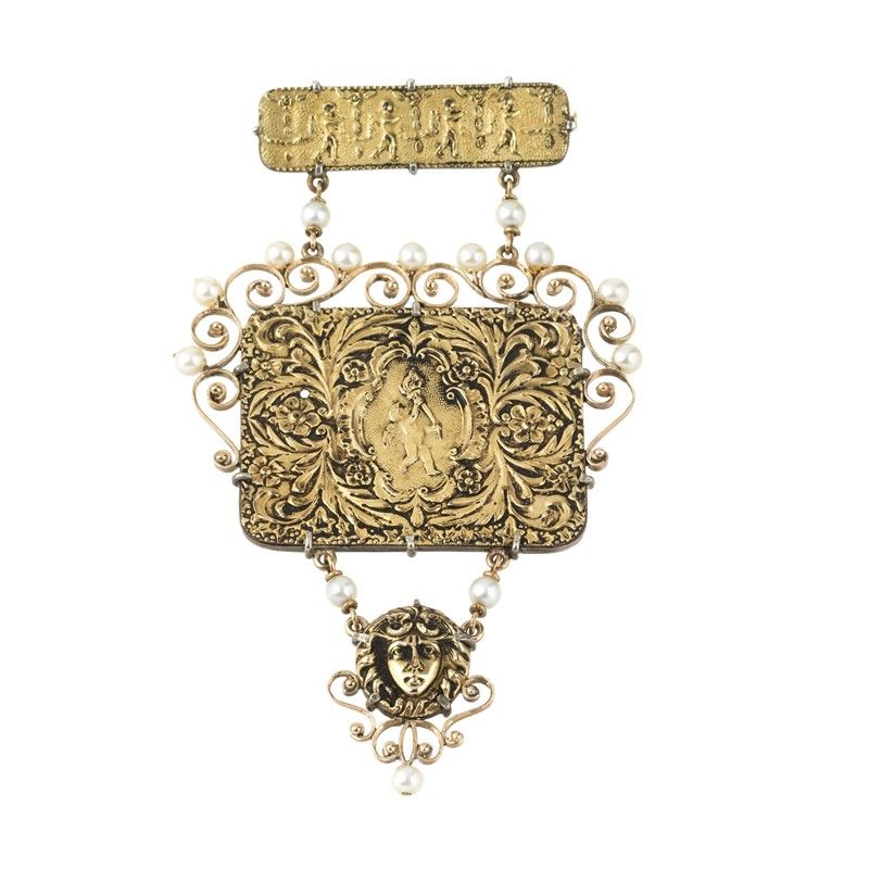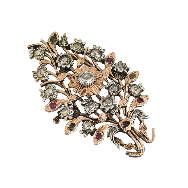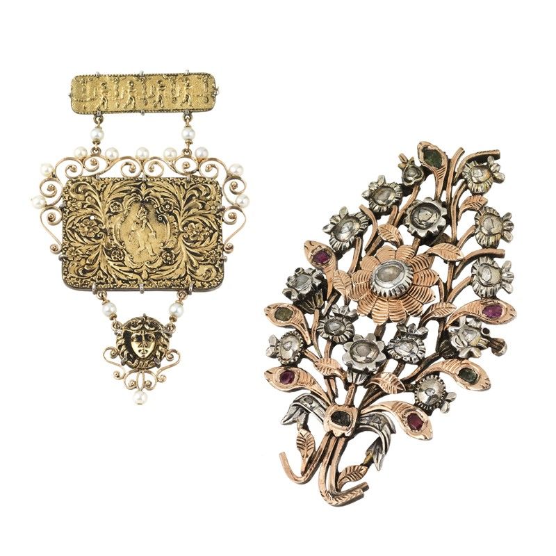 LOTTO COMPOSTO DA DUE SPILLE di cui una composta da elementi pendenti in metallo dorato cesellato cinti da motivi a volute con perle di mm 3 circa, dim. cm 5,5x9 circa, gr. 17, accompagnata da una seconda spilla a tralcio fiorito in argento foderato in oro a basso titolo, impreziosita da rubini e rose di diamante, dim. cm 4x6,5, gr. 27