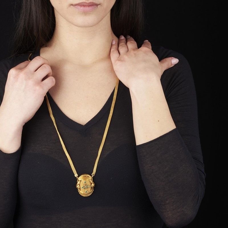catena in oro giallo 18kt, realizzata a maglia tessita, da cui pende un ciondolo in metallo dorato, lungh. cm 82, dim. pendente cm 3x4, gr. 33