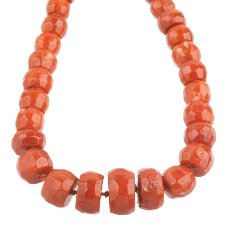 composta da un filo di barilotti in corallo digradanti da mm 17x10 a 5x4 circa, fermatura in oro giallo 18kt, punzoni 750 e del fabbricante, lungh. cm 90, gr. 131