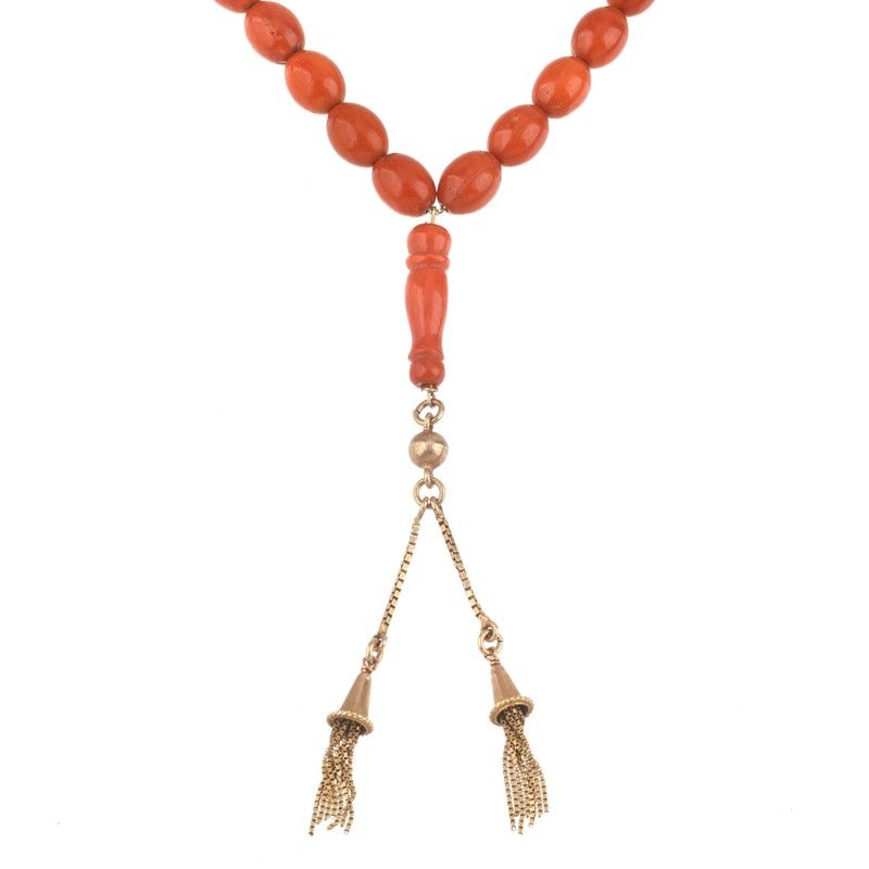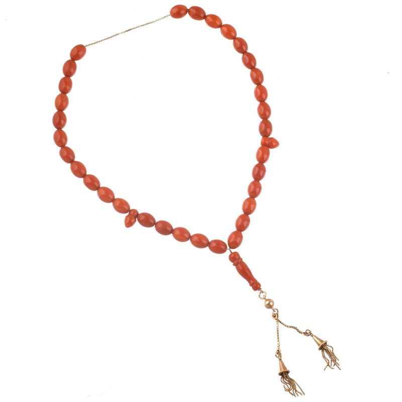 catena in oro a basso titolo, ad un filo di coralli di forma ovale di mm 11x8 circa, con elemento pendente a doppia frangia, lungh. cm 32, gr. 52