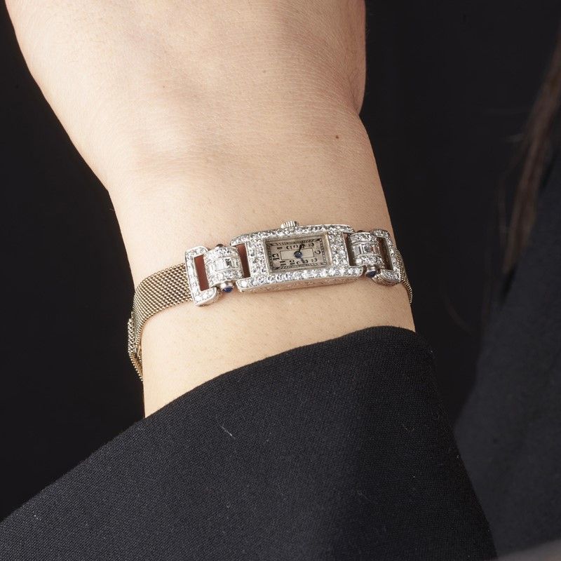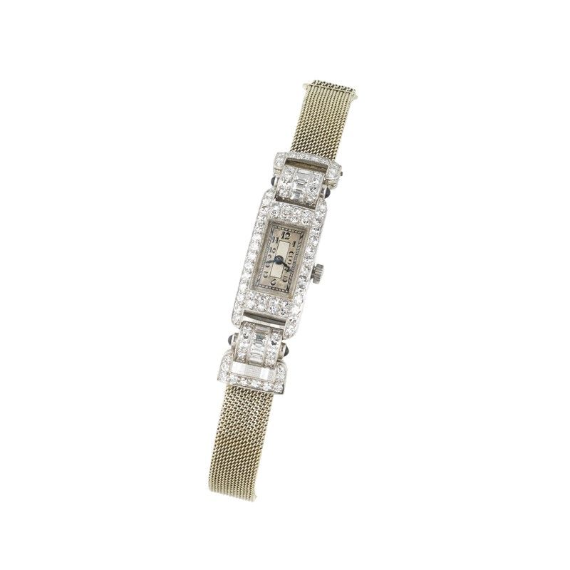 OROLOGIO DA DONNA cassa di forma rettangolare in oro bianco 18kt, ghiera e anse impreziosite da diamanti taglio huit huit e baguette, quadranre argenté, numeri arabi, movimento a carica manuale, bracciale mesh integrato in oro bianco 18kt con lunghezza regolabile, gr. 18