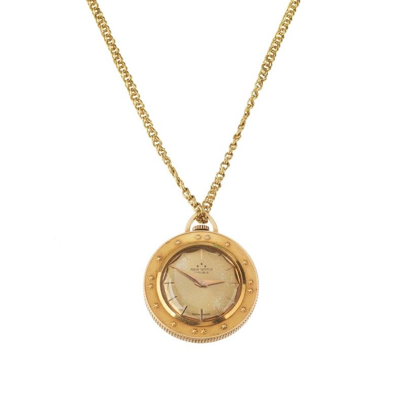 OROLOGIO DA TASCA CON LUNGA CATENA SALISCENDI catena in oro giallo 18kt, da cui pende un orologio da tasca con cassa in oro 18kt, recante sul fondello una moneta, quadrante oro firmato "Agir Watch", indici applicati, movimento a carica manuale, diam. mm 30, lungh. cm 76, gr. 54 complessivi