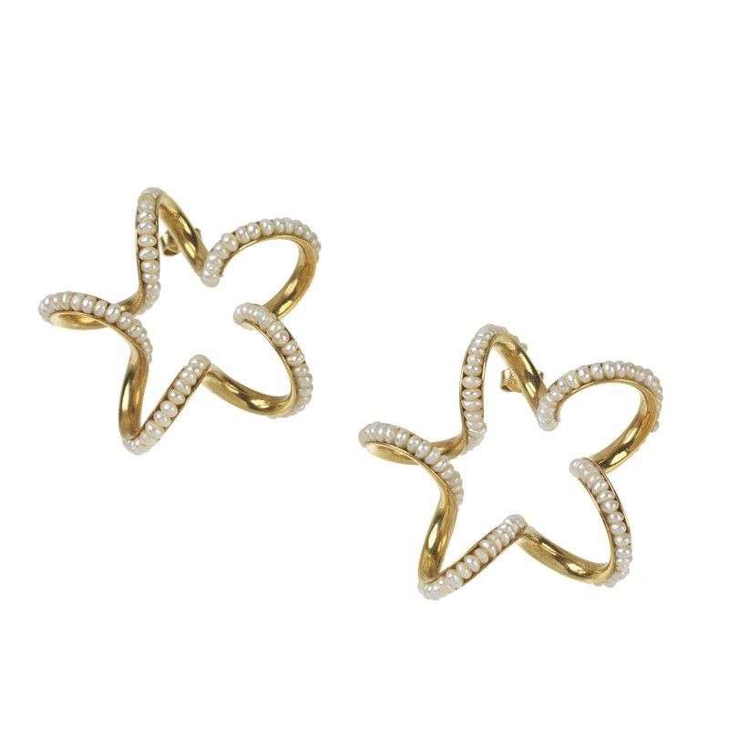 in oro giallo 18kt, di forma onlutata, raffiguranti un motivo a stella impreziosito da una fila continua di microperle, punzone 750, dim. cm 4x4, chiusura a farfallina, gr. 14 complessivi