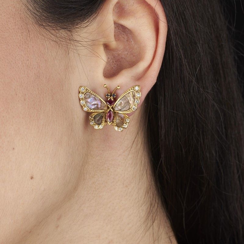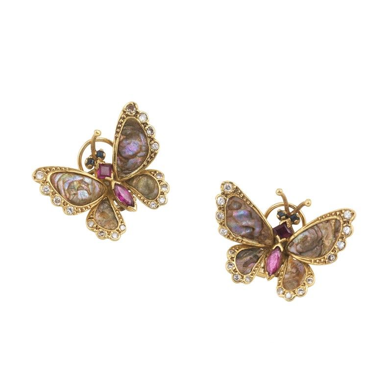 PAIO DI ORECCHINI A FORMA DI FARFALLA in oro giallo 18kt, impreziositi da inserti in madreperla, zaffiri e rubini taglio fantasia e diamanti taglio brillante per ct 0.30 circa, chiusura a clip con perno, dim. cm 2,5x2 circa, gr. 8 complessivi