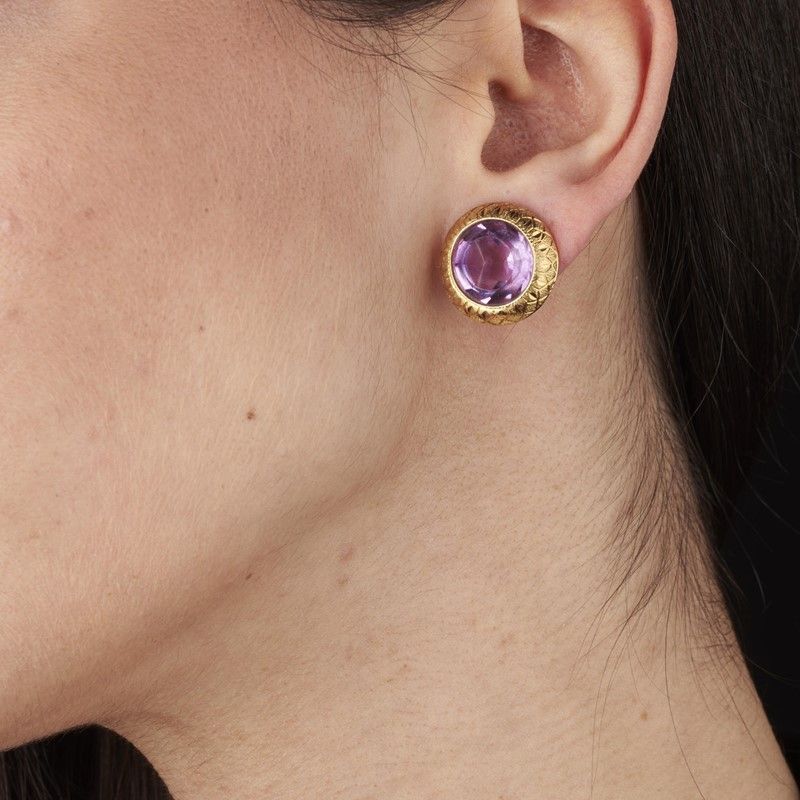 in oro giallo 18kt, di forma circolare, raffiguranti un motivo floreale, con al centro due ametiste sfaccettate, punzone 750, chiusura a clip con perno, dim. cm 2x2 circa, gr. 9 complessivi