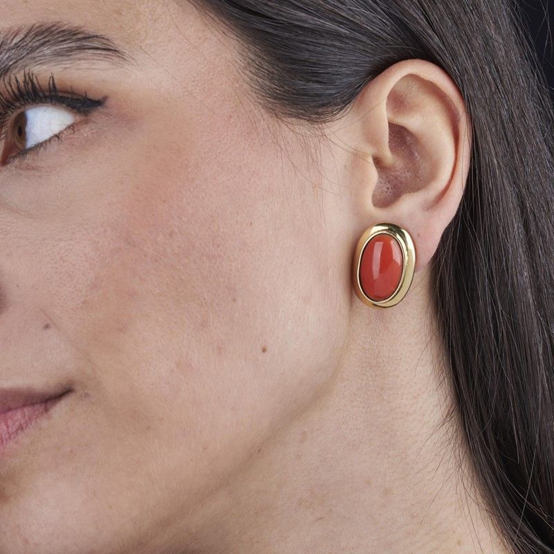 in oro giallo 18kt, di forma ovale, impreziositi al centro da coralli taglio cabochon, punzoni 750 e del fabbricante, chiusura a clip con perno, dim. cm 1,5x2,5, gr. 17 complessivi