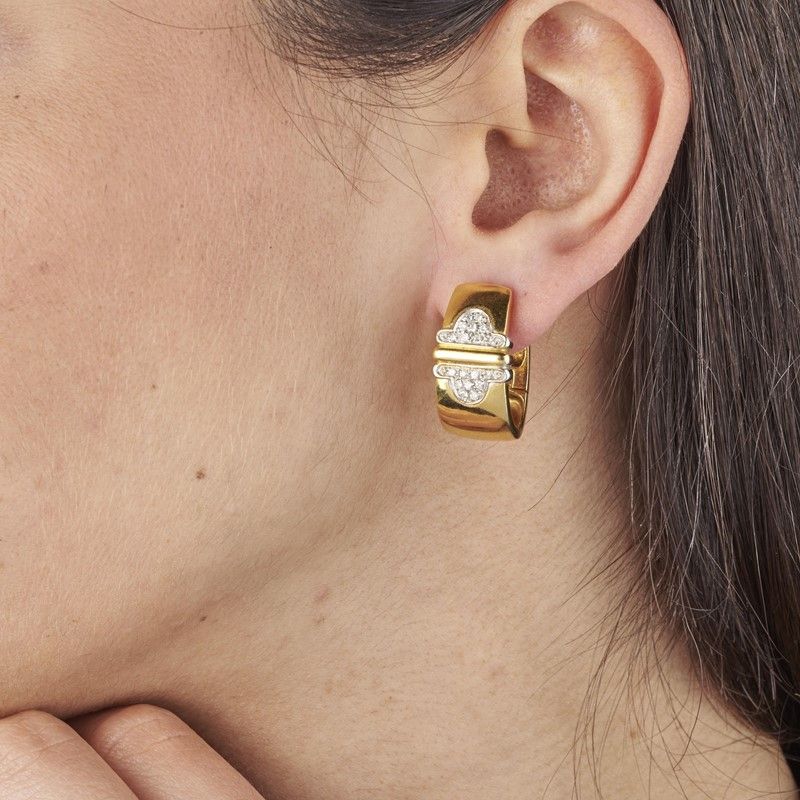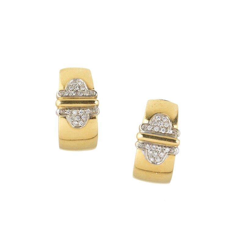 in oro giallo e bianco 18kt, impreziositi da diamanti taglio brillante per ct 0.30 circa, punzoni 750 e del fabbricante, dim. cm 1x2,5, gr. 16 complessivi