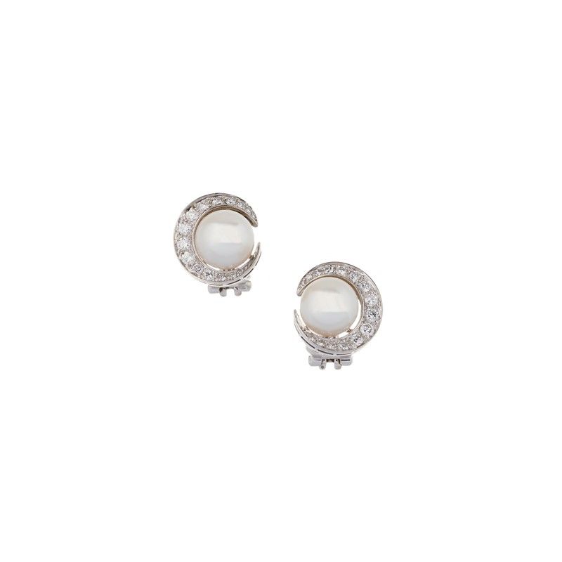 in oro bianco 18kt, impreziositi al centro da perle di mm 9 circa cinte da diamanti taglio brillante per ct 0.60 circa, punzone 750, chiusura a clip, dim. cm 1,5x1,5 circa, gr. 9 complessivi