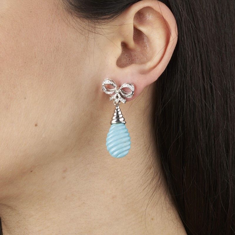 PAIO DI ORECCHINI PENDENTI CON PASTA DI TURCHESE E DIAMANTI in oro bianco 18kt, realizzati a forma di fiocchi impreziositi da diamanti taglio brillante e huit huit per ct 0.40 circa, con due elementi a goccia in pasta di turchese dalla superficie scanalata, chiusura a farfallina, punzone 750, dim. cm 1,5x4 circa, gr. 15 complessivi
