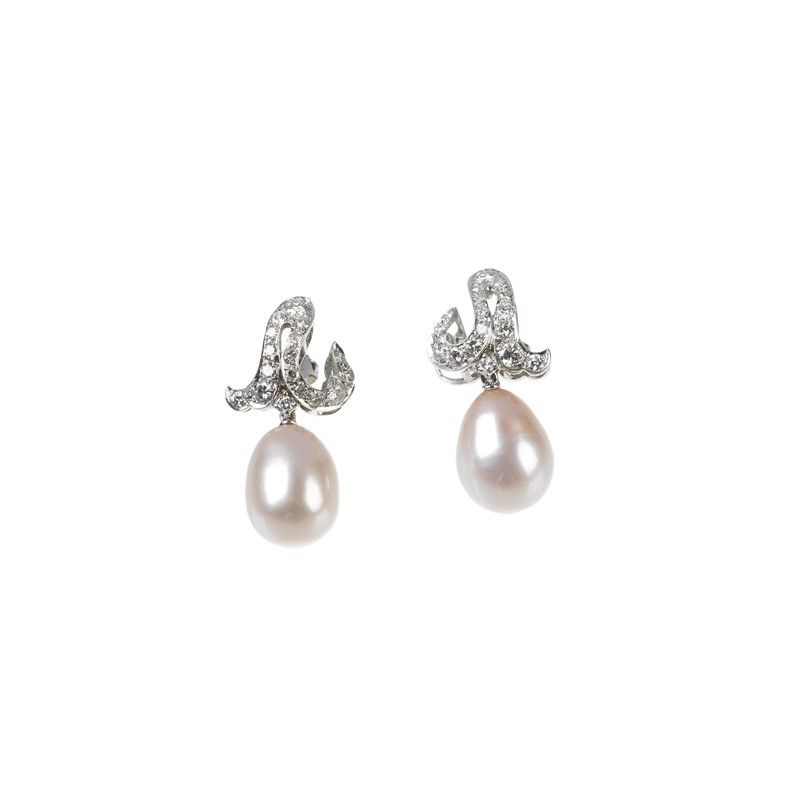 PAIO DI ORECCHINI PENDENTI CON PERLE E DIAMANTI in oro bianco 18kt, impreziositi da diamanti taglio brillante e huit huit per ct 0.80 circa, da cui pendono due perle a goccia di mm 10x13 circa, punzone 750, chiusura a farfallina, lungh. cm 3 circa, gr. 8 complessivi