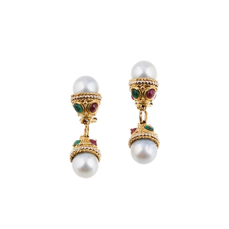 PAIO DI ORECCHINI PENDENTI CON PERLE SOUTH SEA E PIETRE DI COLORE in oro giallo e bianco 18kt, ciascuno composto da due perle south sea di mm 12 circa cinte da elementi troncoconici impreziositi da dischi di rubini e smeraldi, con piccoli diamanti taglio brillante, chiusura a clip con perno, dim. cm 1,5x5 circa, gr. 39 complessivi