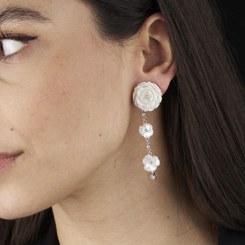 PAIO DI ORECCHINI PENDENTI CON ROSE IN MADREPERLA