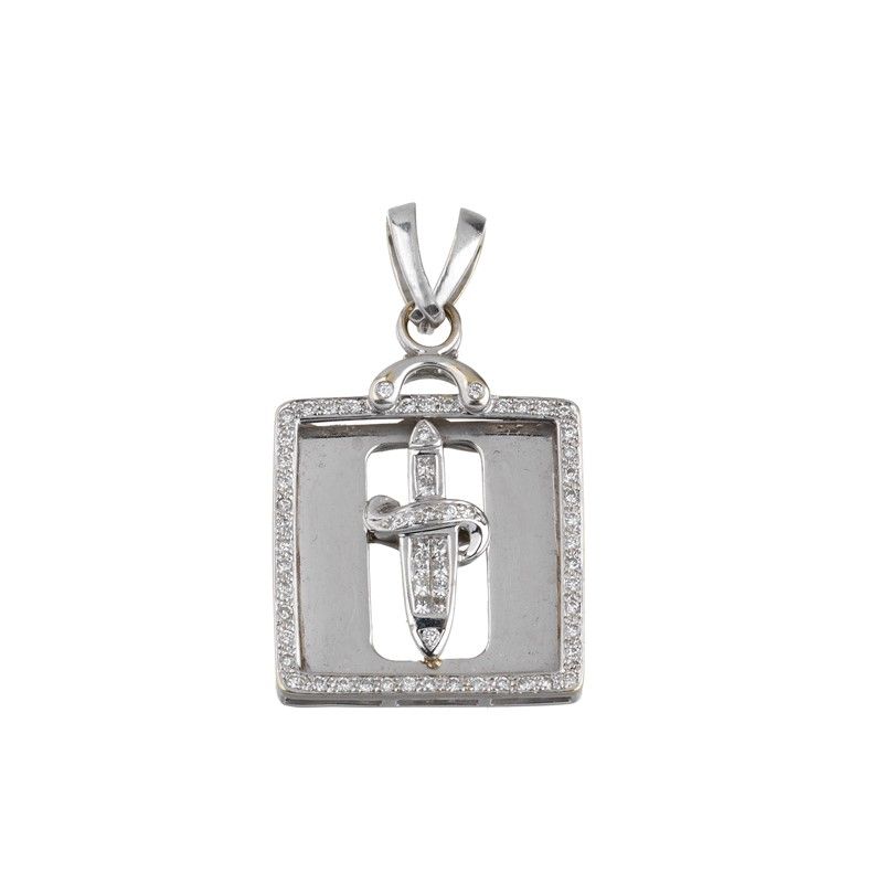 in oro bianco 18kt, di forma quadrata, raffigurante al centro una spada con fodero, impreziosito da diamanti taglio princess e brillante per ct 0.80 circa, punzoni 750 e 18kt, dim. cm 2,5x4,5, gr. 14