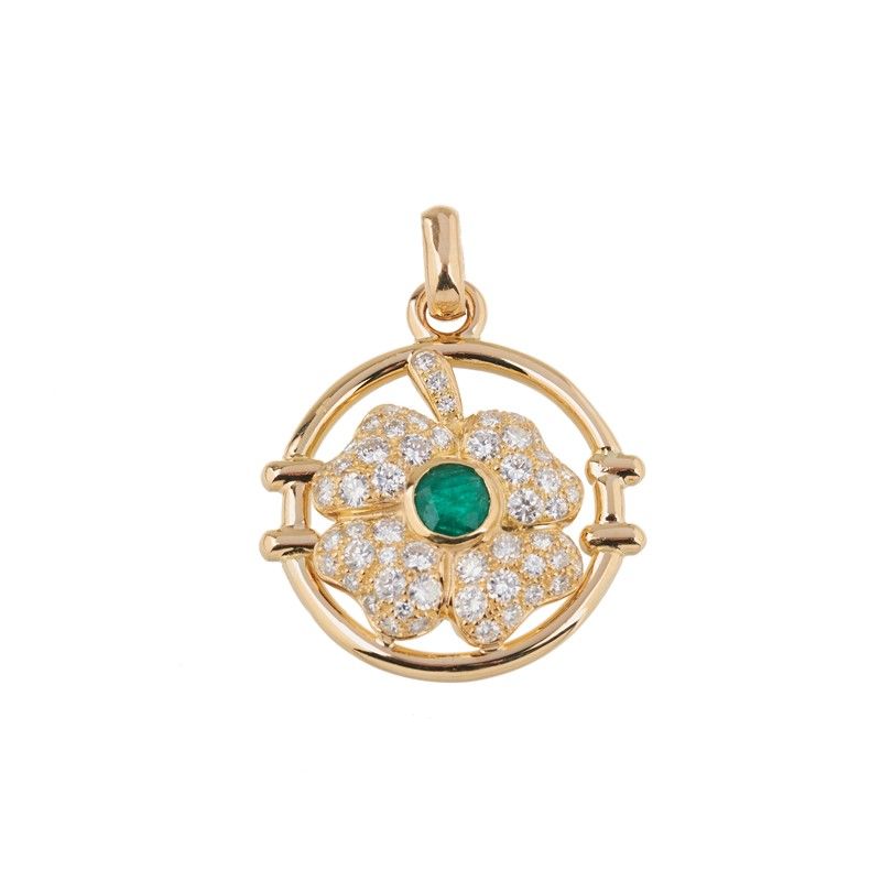 in oro giallo 18kt, al centro un fiore impreziosito da diamanti taglio brillante per ct 1.20 circa e uno smeraldo centrale taglio rotondo di ct 0.50 circa, punzoni 750 e del fabbricante, dim. cm 2,5x3,5, gr. 12