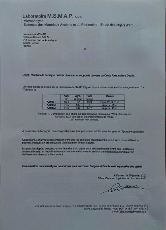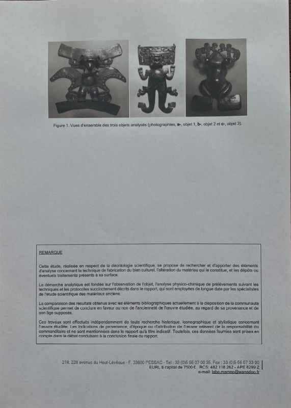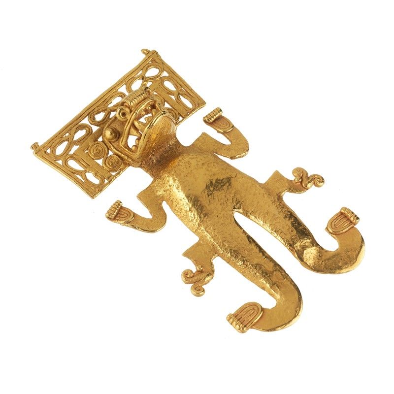 PETTORALE/PENDENTE STILE PRECOLOMBIANO in oro giallo 22kt circa sbalzato, raffigurante un giaguaro stilizzato, dim. cm 5,5x9, gr. 80. Corredato di certificato di microanalisi francese dei materiali antichi M.S.M.A.P. del 10/01/2023 attestante il titolo dell'oro.