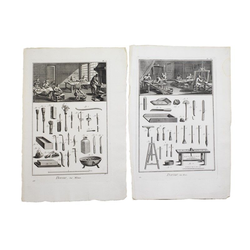 SERIES OF 4 PLATES AND INDEX OF ENCYCLOPÉDIE, OU DICTIONNAIRE RAISONNÉ DES SCIENCES, DES ARTS ET DES MÉTIERS BY DENIS DIDEROT E JEAN LE ROND D'ALEMBERT - DOREUR engraving on watermarked laid paper, mm 440x290
