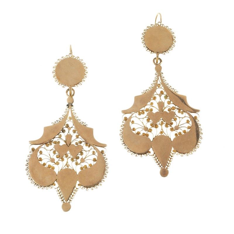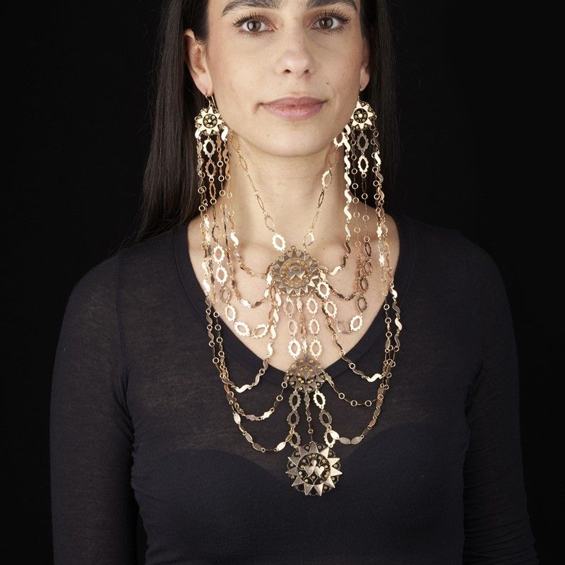 SET GIOIELLI ETNICI in oro 9kt, composta da paio di grandi orecchini pendenti di dim. cm 4,5x10 circa, con chiusura a monachella, e ampia collana pettorale con alle estremità due ganci da inserire nei lobi come orecchini, da cui si diramano varie catene unite al centro da elementi solari recanti al centro dei cuori, lungh. cm 35 circa, gr. 62