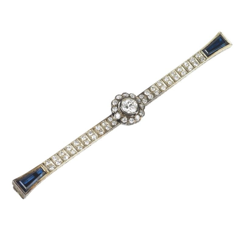SPILLA A BARRETTA CON DIAMANTI E ZAFFIRI SINTETICI in oro bianco 18kt, impreziosita da diamanti taglio vecchio, brillante e huit huit per ct 0.40 circa, con al centro un fiore composto da un diamante centrale di ct 0.40 circa circondato da una corolla di diamanti taglio vecchio per ct 0.20 circa, e all'estremità due zaffiri sintetici taglio tapes, lungh. cm 8,5, gr. 7