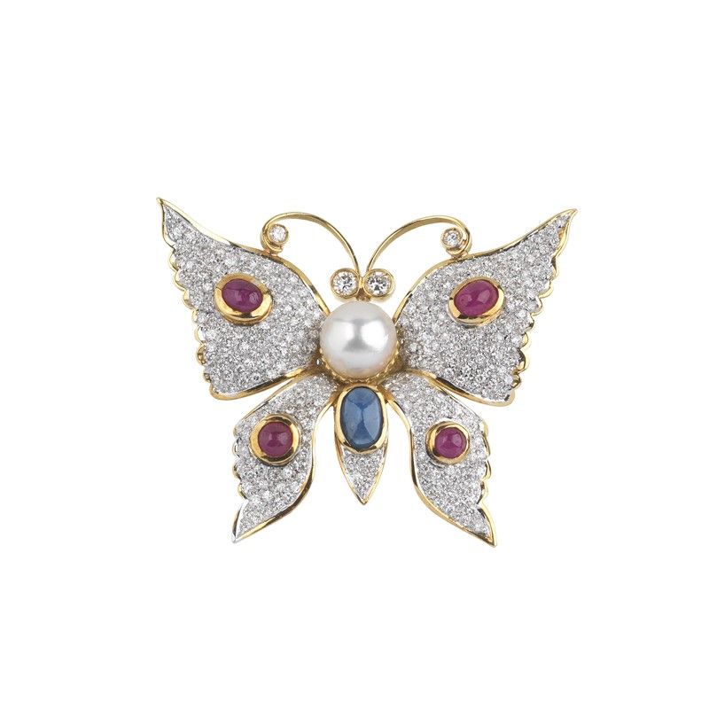 SPILLA A FORMA DI FARFALLA CON PERLA PIETRE DI COLORE E DIAMANTI in oro giallo e bianco 18kt, con al centro una perla di mm 9 circa, zaffiri e rubini taglio cabochon per ct 3 circa, impreziosita da pavé di diamanti taglio brillante per ct 3.50 circa, punzone 750, dim. cm 5x4,5, gr. 19