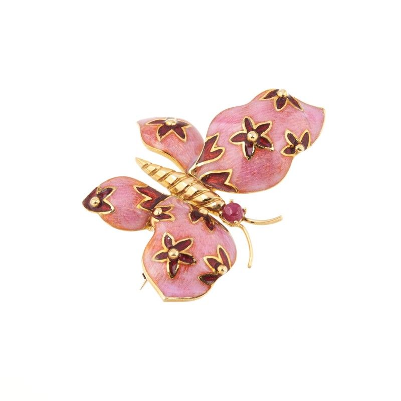 in oro giallo 18kt, decorata in smalto rosa e rosso, con un rubino taglio cabochon, punzoni 750 e del fabbricante, dim. cm 5x4, gr. 16