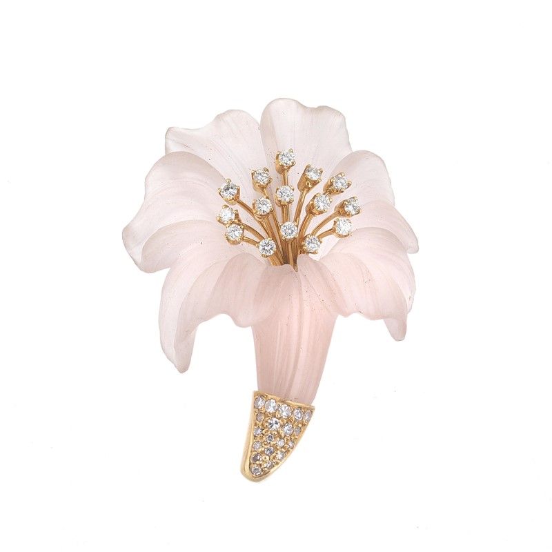 in oro giallo 18kt, petali realizzati in cristallo rosa inciso, impreziosita da diamanti taglio brillante e huit huit per ct 0.60 circa, punzone 750, dim. cm 4x5, gr. 22