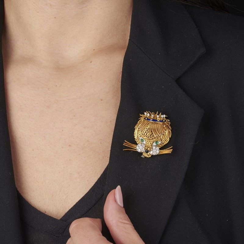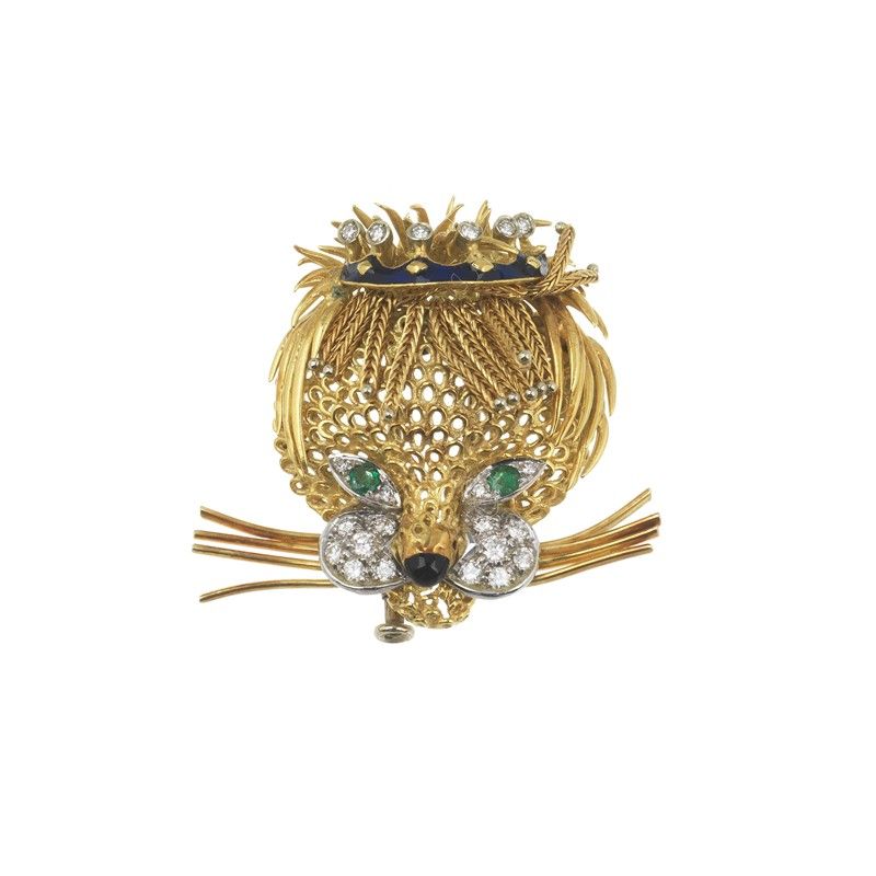 SPILLA A FORMA DI LEONE in oro giallo e bianco 18kt, raffigurante un leone incoronato, decorato in smalto blu e impreziosito da due smeraldi taglio rotondo e diamanti taglio brillante e huit huit per ct 0.60 circa, punzoni 750 e del fabbricante, dim. cm 4x3,5, gr. 20