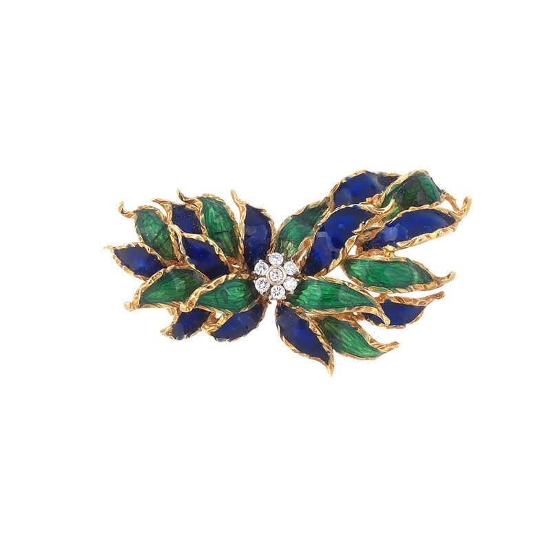 SPILLA A TRALCIO FIORITO CON DIAMANTI in oro giallo e bianco 18kt, decorato in smalto blu e verde, con al centro un fiore di diamanti taglio brillante per ct 0.20 circa, punzoni 750 e del fabbricante, dim. cm 5x2,5, gr. 18