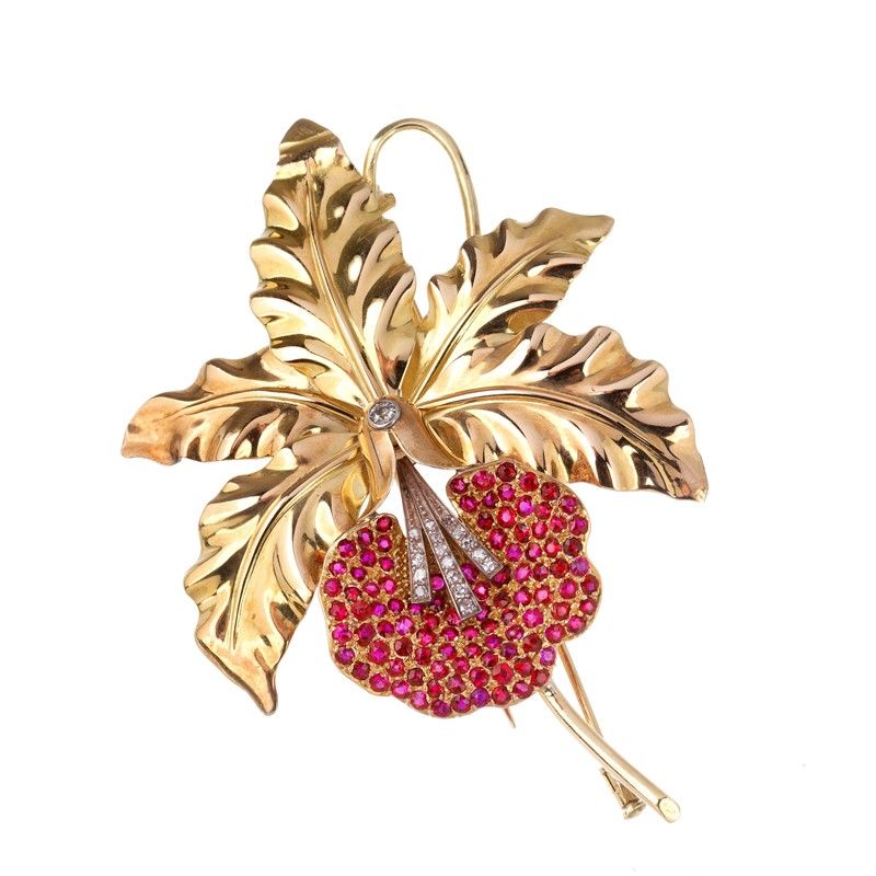 SPILLA A TRALCIO FIORITO in oro giallo 18kt e argento, impreziosita da rubini taglio rotondo per ct 2 circa e diamanti taglio vecchio e huit huit per ct 0.20 circa, dim. cm 5,5x8,5, gr. 26