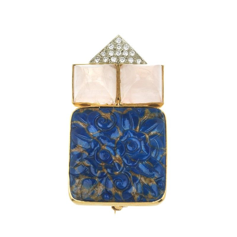 SPILLA CON LAPISLAZZULI QUARZI E DIAMANTI in oro giallo e bianco 18kt, di forma geometrica, impreziosita da un grande lapislazzuli con motivo floreale inciso sormontato da due quarzi rosa taglio sugar loaf e diamanti taglio brillante per ct 0.40 circa, punzone 750, dim. cm 3x5,5, gr. 23