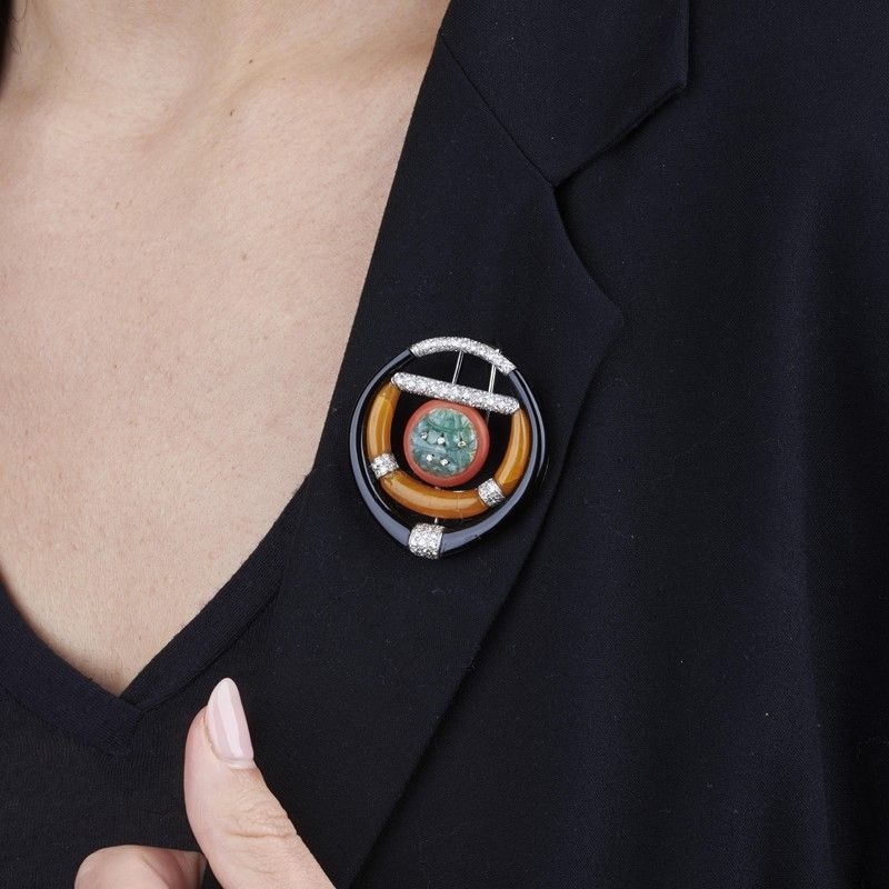 in oro bianco 18kt, impreziosita da parti in onice e diamanti taglio rotondo per ct 0.90 circa, con al centro una giada incisa e piccoli diamanti taglio huit huit, dim. cm 4x4,5, gr. 20