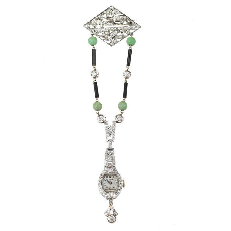 in oro bianco 18kt, di forma romboidale, impreziosita da diamanti taglio vecchio per ct 0.50 circa, da cui pendono sfere alternate a cilindri in onice e diamanti taglio vecchio per ct 0.30 circa, con parte terminale in platino impreziosita da diamanti taglio vecchio, huit huit e baguette per ct 1 circa, recante un orologio con cassa in platino, quadrante bianco firmato "Croton", numeri arabi, movimento a carica manuale, punzone 900 PLAT, dim. cm 3,5x12 circa, gr. 17