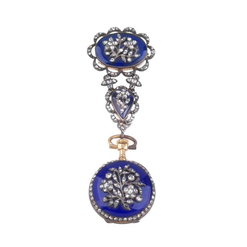 in oro e argento, composta da elementi pendenti impreziositi da rose di diamante e decorata in smalto blu con sopra applicati tralci fioriti in argento, da cui pende un piccolo orologio da tasca, cassa in oro e argento impreziosita da rose di diamante (una mancante) e smalto, quadrante guilloché in smalto blu, numeri arabi, movimento a carica manuale (difetti), dim. cm 2,5x8 circa complessivi, diam. orologio mm 23, gr. 30